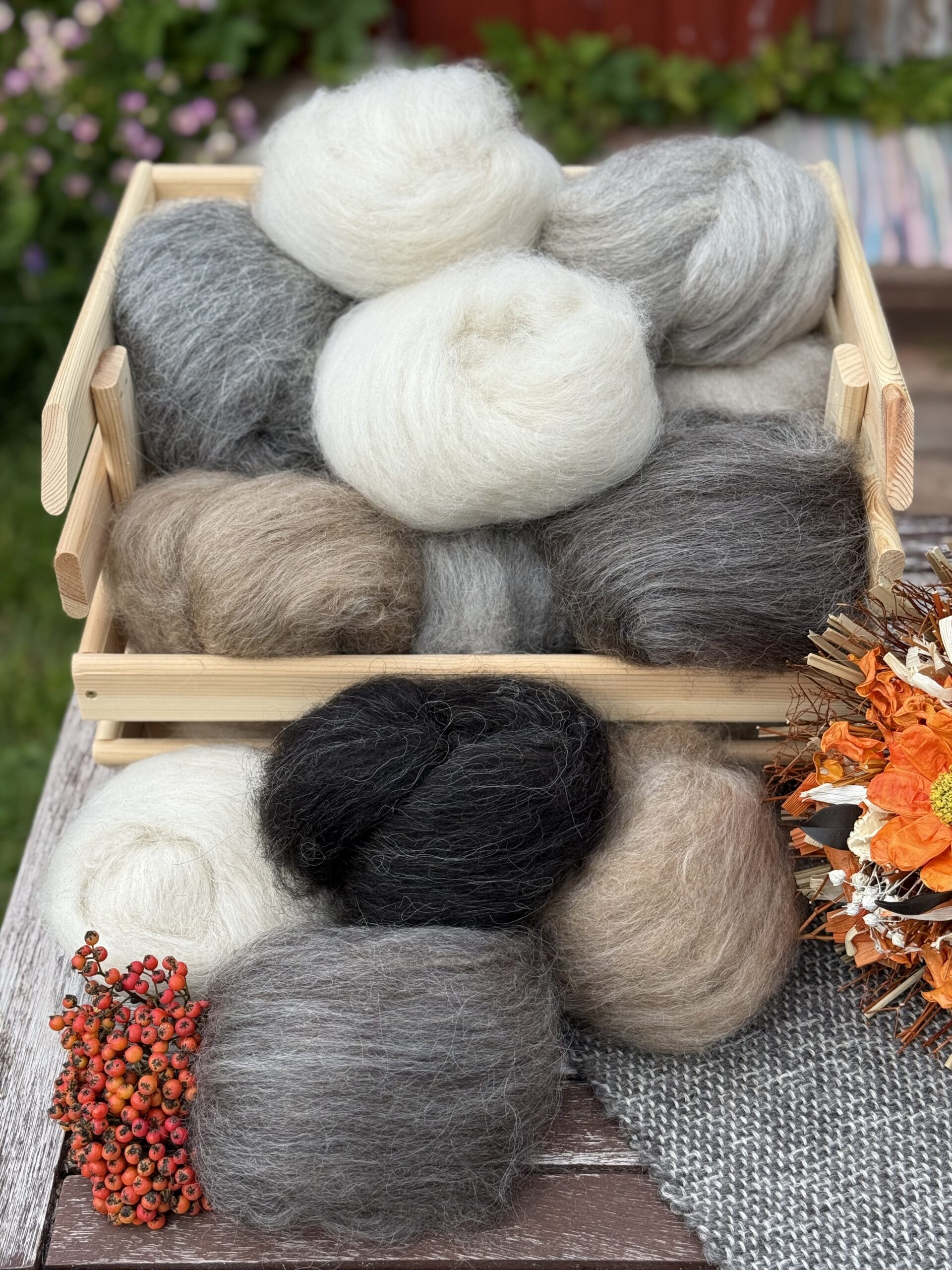 Tilalla vesipesty ja karstattu villa. Sopii mm. huovutukseen ja kehräykseen.